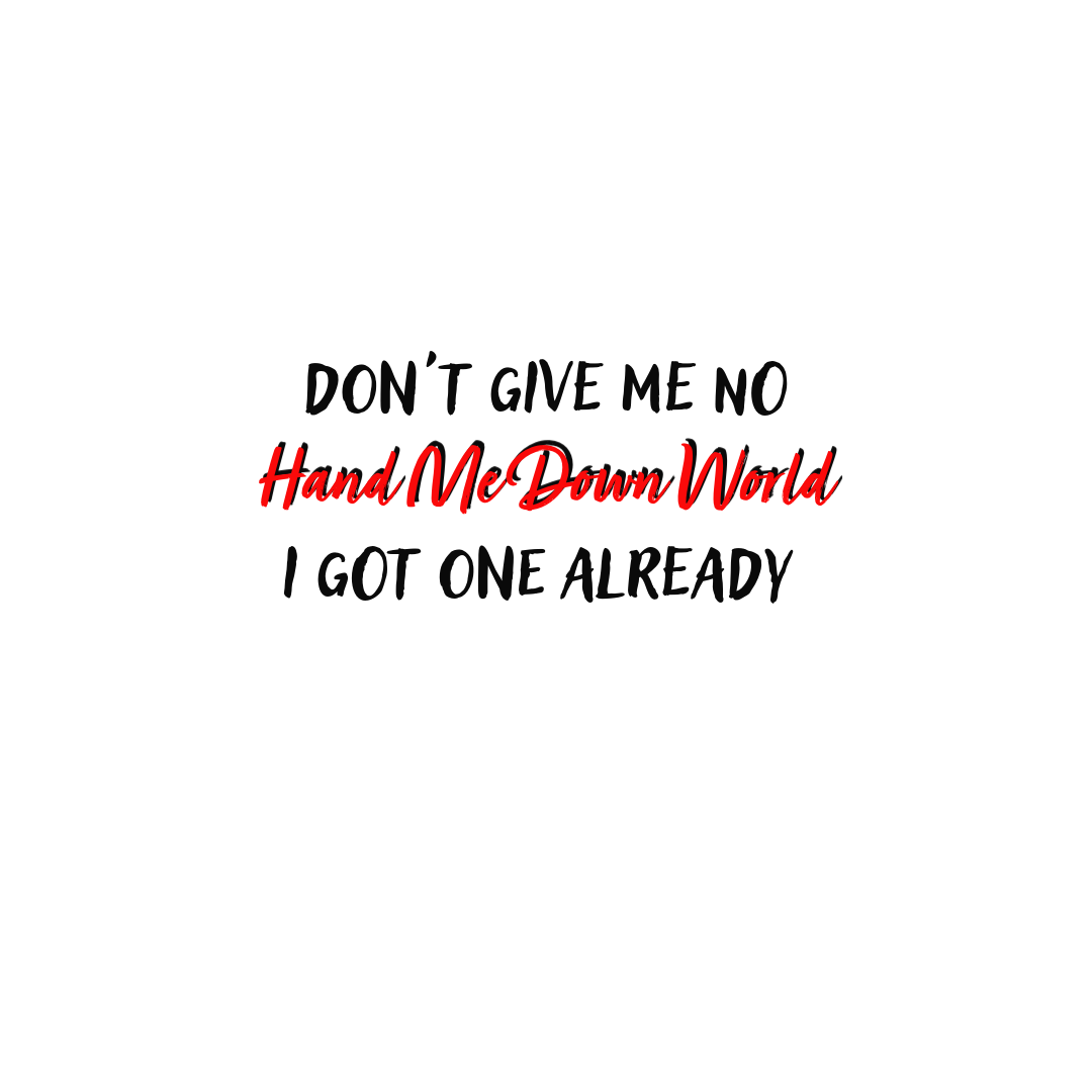 Featuring the lyrics from the hit song "Hand Me Down World", written by Kurt Winter, released by The Guess Who in 1970.