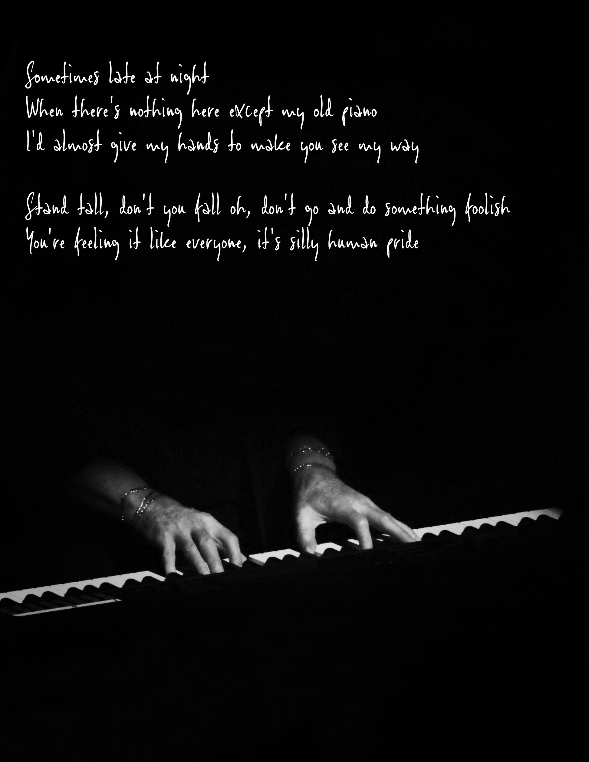 “Sometimes late at night / When there’s nothing here except my old piano / I’d almost give my hands to make you see my way / Stand tall, don’t you fall oh, don’t go and do something foolish / You’re feeling it like everyone, it’s silly human pride”